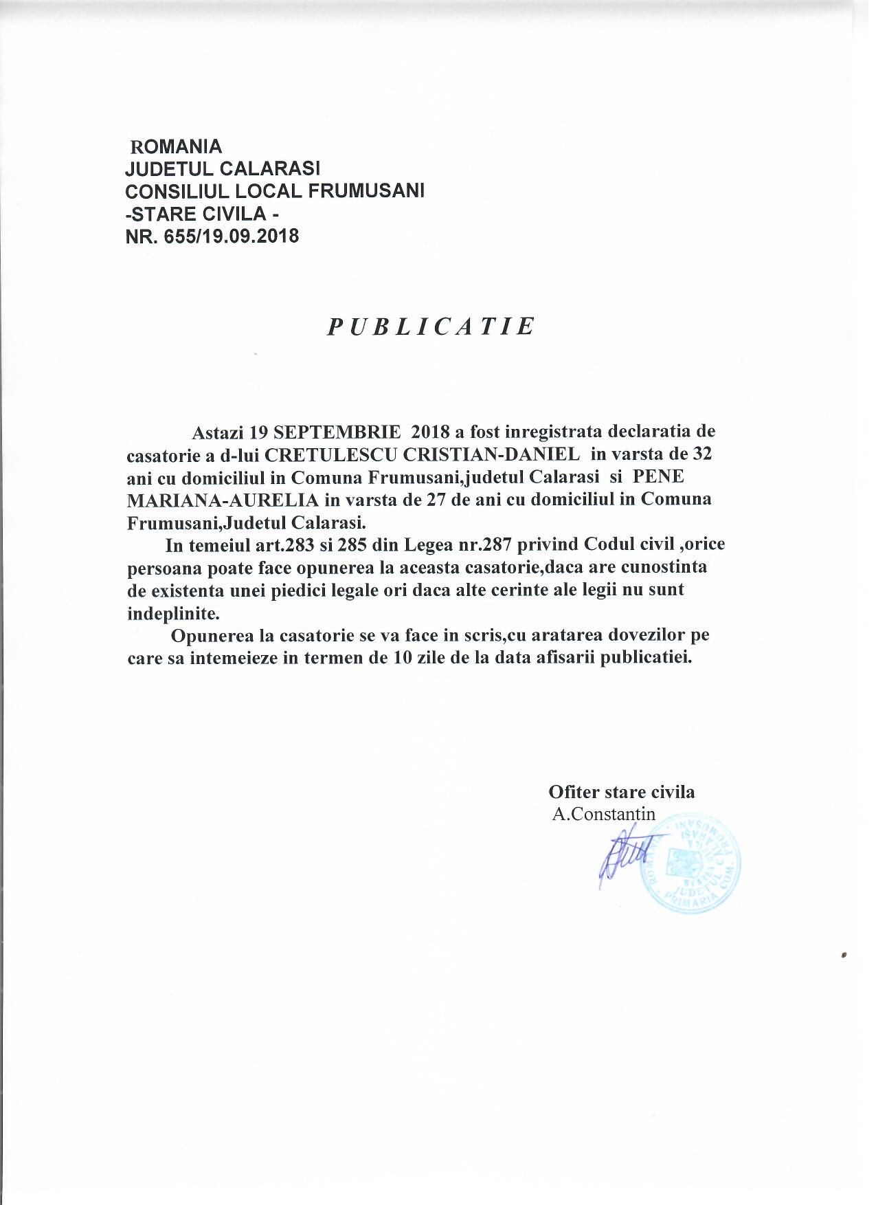 Stare Civila 19 September 2018 Hits: 989 Declaratie de casatorie - Cretulescu Cristian si Pene Mariana Print Email PDF Declaratie de casatorie - Cretulescu Cristian si Pene Mariana Prev Next