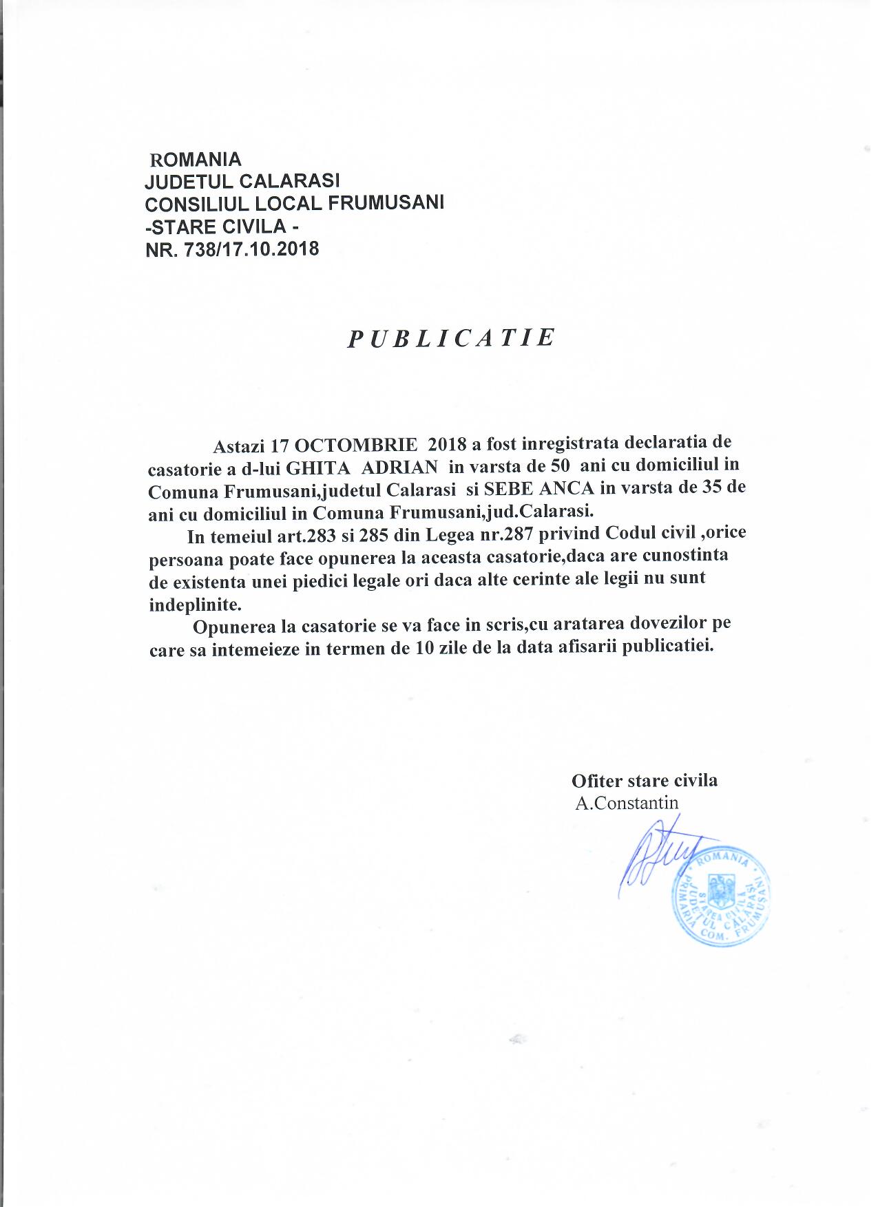 Stare Civila 18 October 2018 Hits: 1350 Declaratie de casatorie - Ghita Adrian si Sebe Anca Print Email PDF Prev Next
