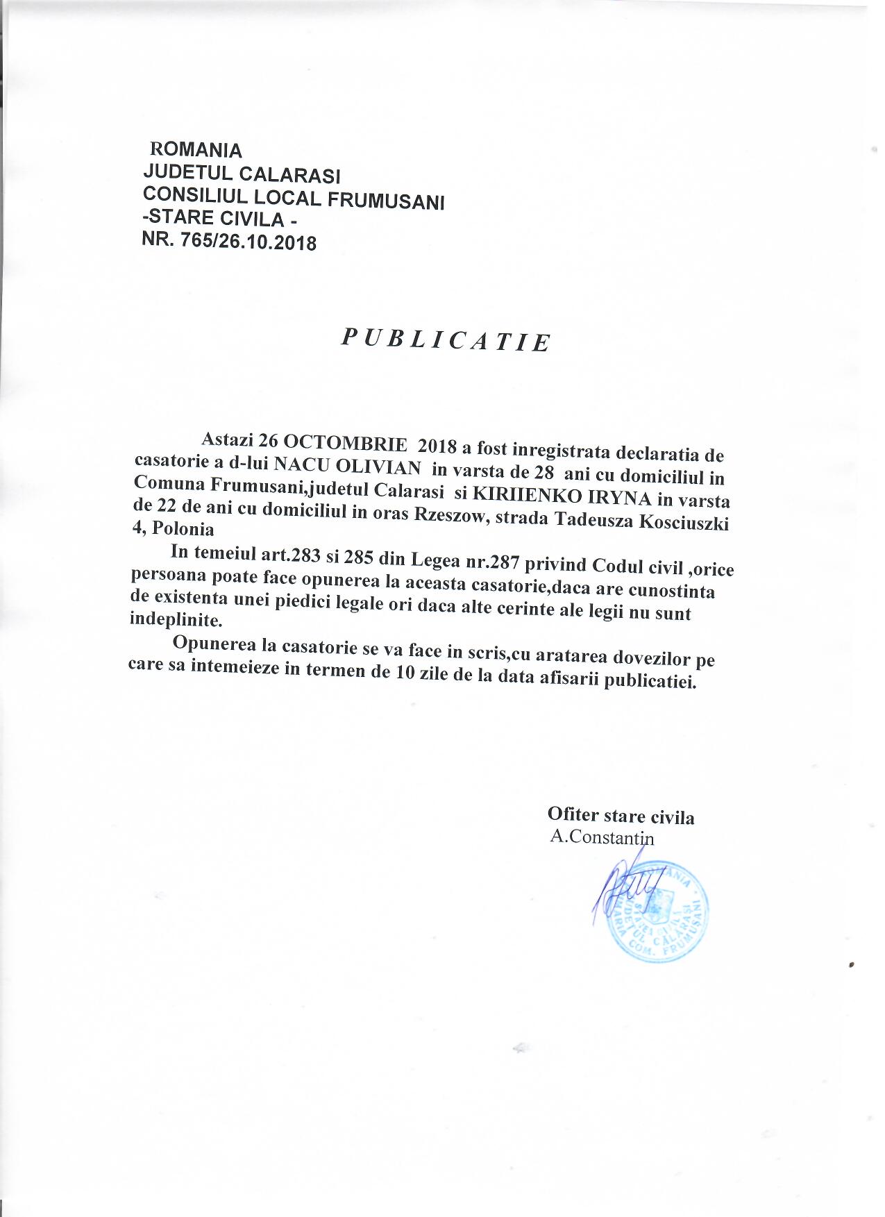 Stare Civila 26 October 2018 Hits: 1127 Declaratie de casatorie - Nacu Olivian si Kiriienko Iryna Print Email PDF Prev Next