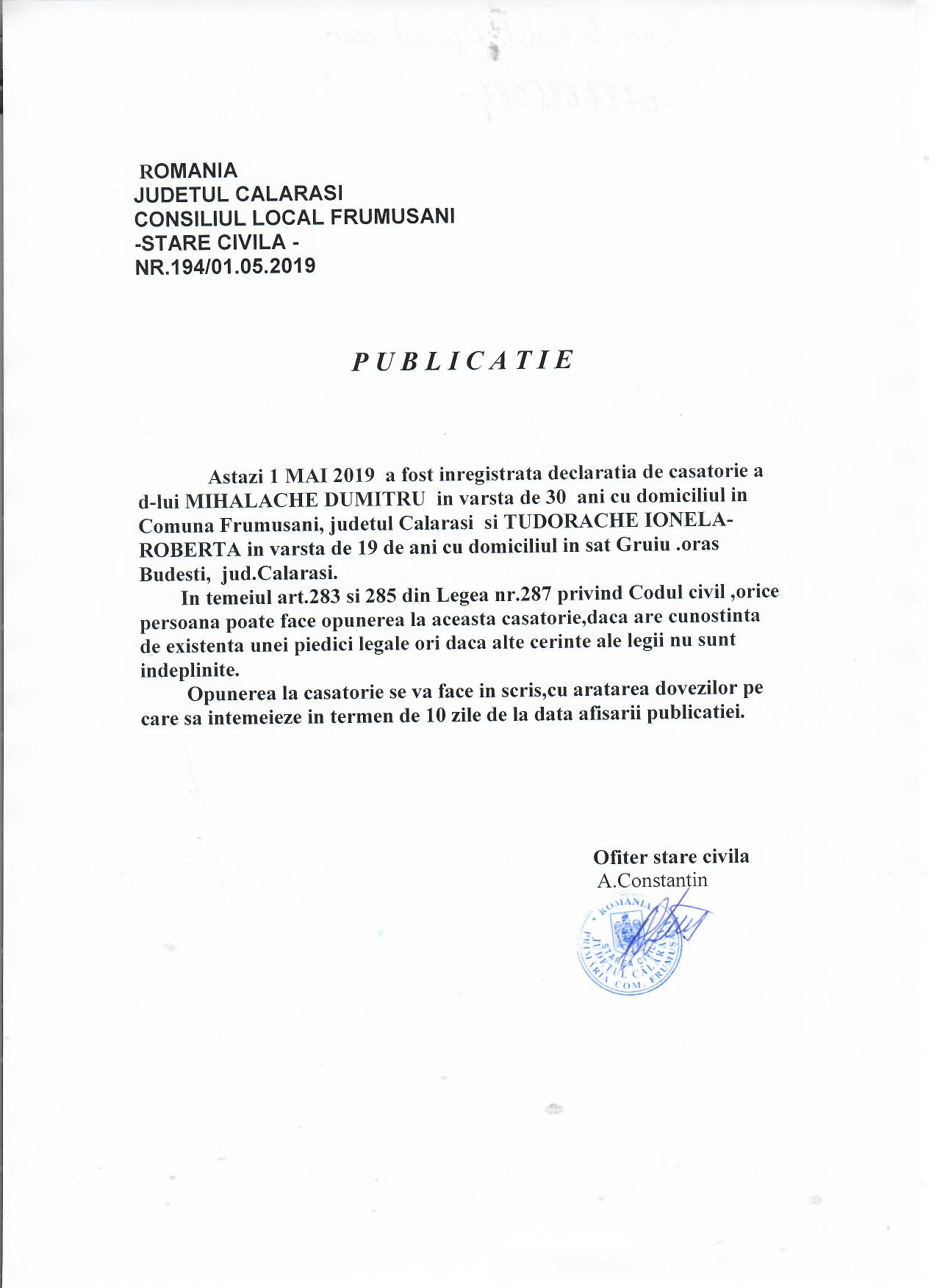 Stare Civila 01 May 2019 Hits: 793 Declaratie de casatorie - Mihalache Dumitru si Tudorache Ionela-Roberta Print Email PDF Prev Next