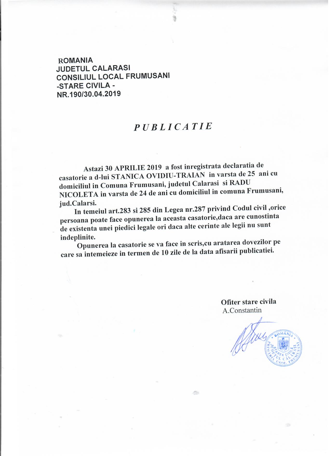 Stare Civila 30 April 2019 Hits: 963 Declaratie de casatorie - Stanica Ovidiu si Radu Nicoleta Print Email PDF Prev Next
