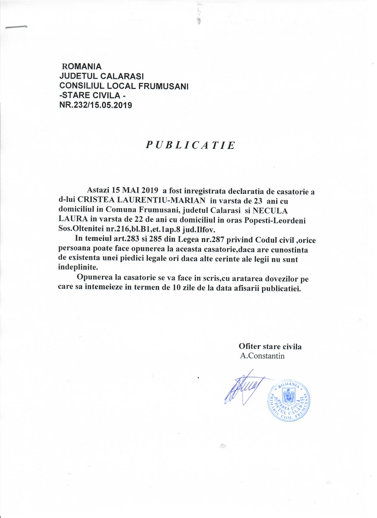 Stare Civila 15 May 2019 Hits: 1311 Declaratie de casatorie - CRISTEA LAURENTIU-MARIAN/NECULA LAURA Print Email PDF Prev Next