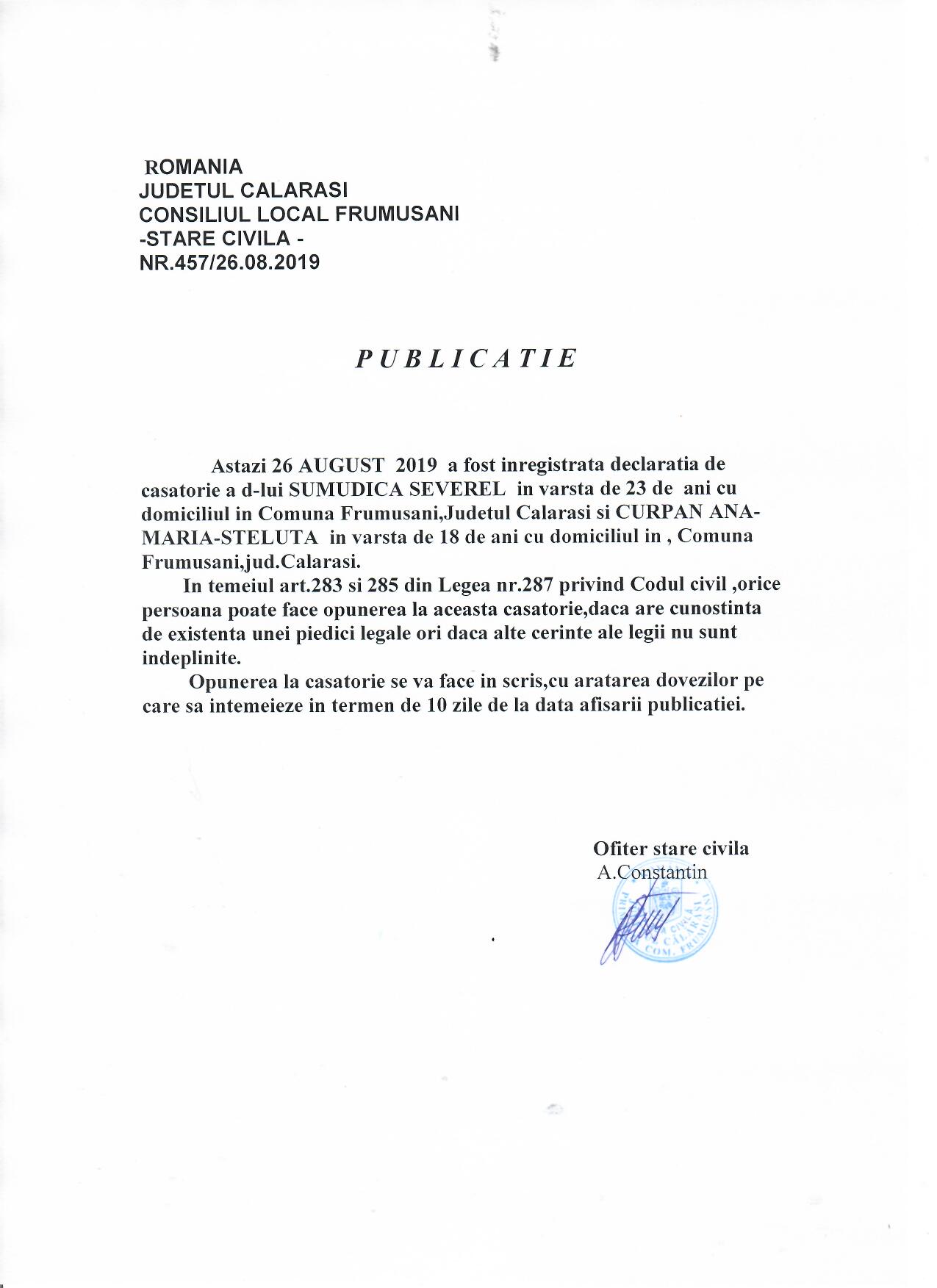 Stare Civila 26 August 2019 Hits: 717 Declaratie de casatorie - SUMUDICA SEVEREL/CURPAN ANA-MARIA-STELUTA Print Email PDF Prev Next
