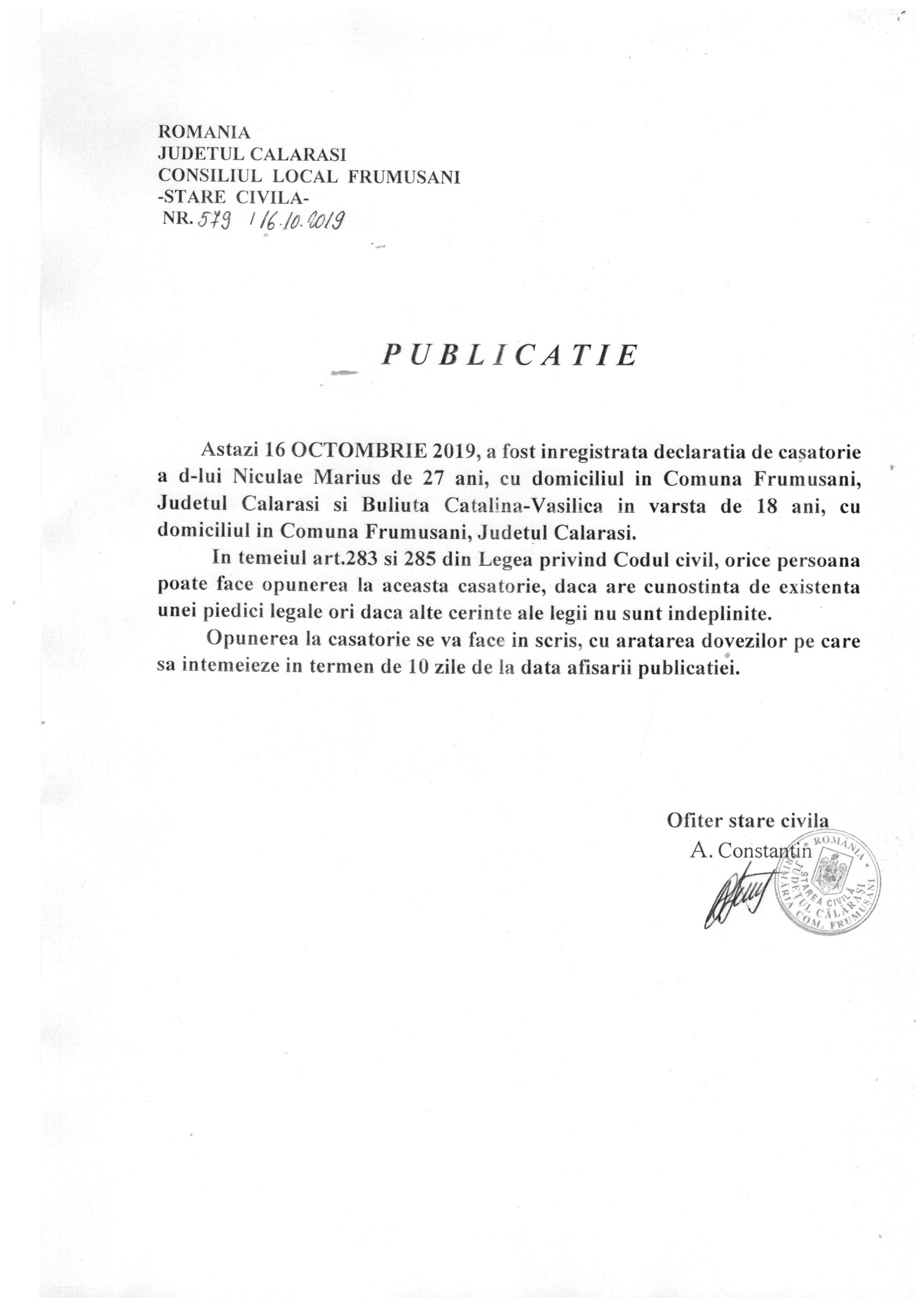 Stare Civila 17 October 2019 Hits: 762 Publicatie de casatorie pentru Niculae Marius si Buliuta Catalina Print Email PDF Prev Next