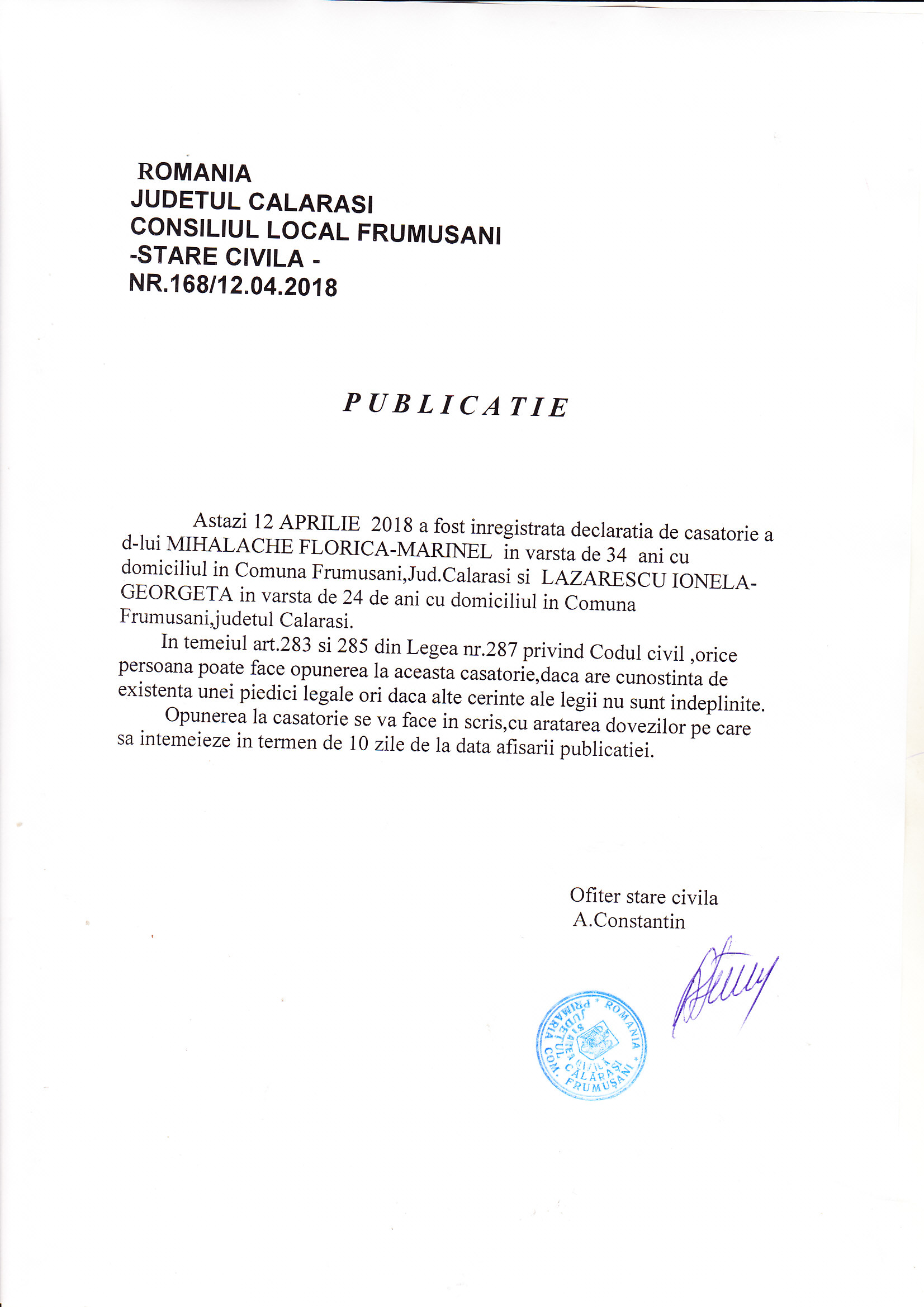 Stare Civila 12 April 2018 Hits: 1011 Declaratie de casatorie - Mihalache Florica si Lazarescu Ionela Print Email PDF Prev Next