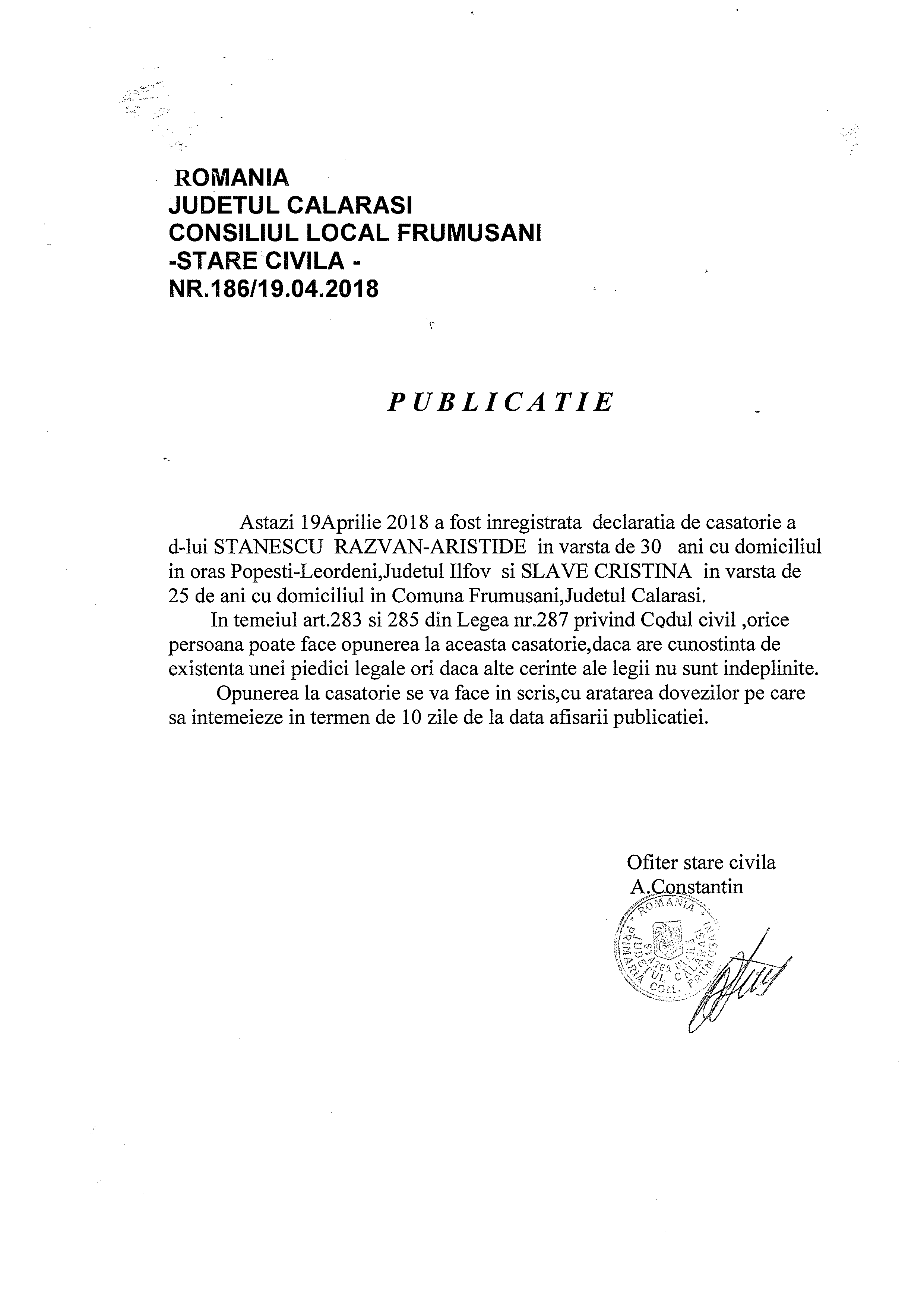 Stare Civila 19 April 2018 Hits: 1084 Declaratie de casatorie - Stanescu Razvan si Slave Cristina Print Email PDF Prev Next