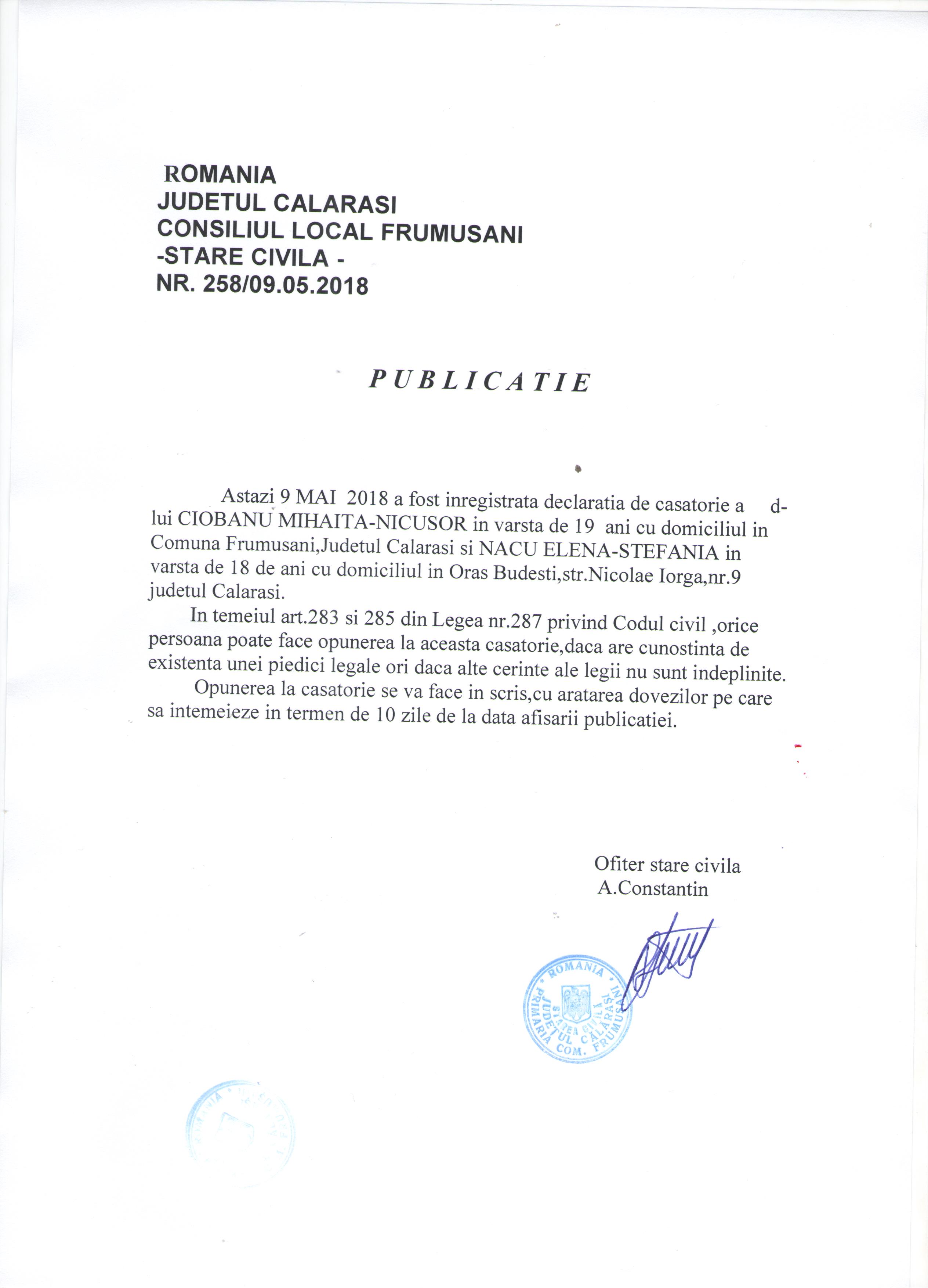 Stare Civila 09 May 2018 Hits: 969 Declaratie de casatorie - Ciobanu Mihaita si Nacu Elena Print Email PDF Prev Next