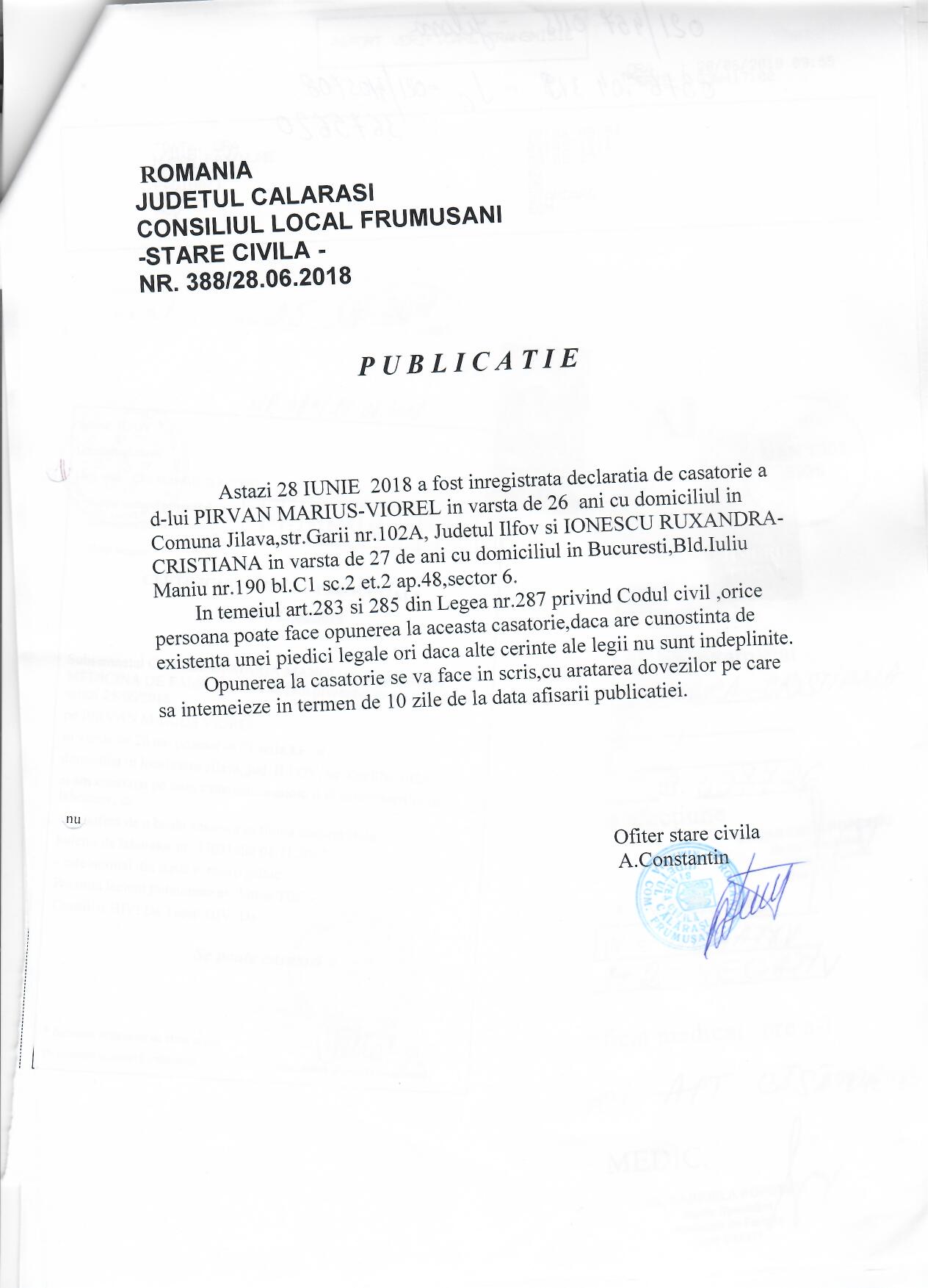 Stare Civila 28 June 2018 Hits: 960 Declaratie de casatorie - Pirvan Marius si Ionescu Ruxandra Print Email PDF Prev Next