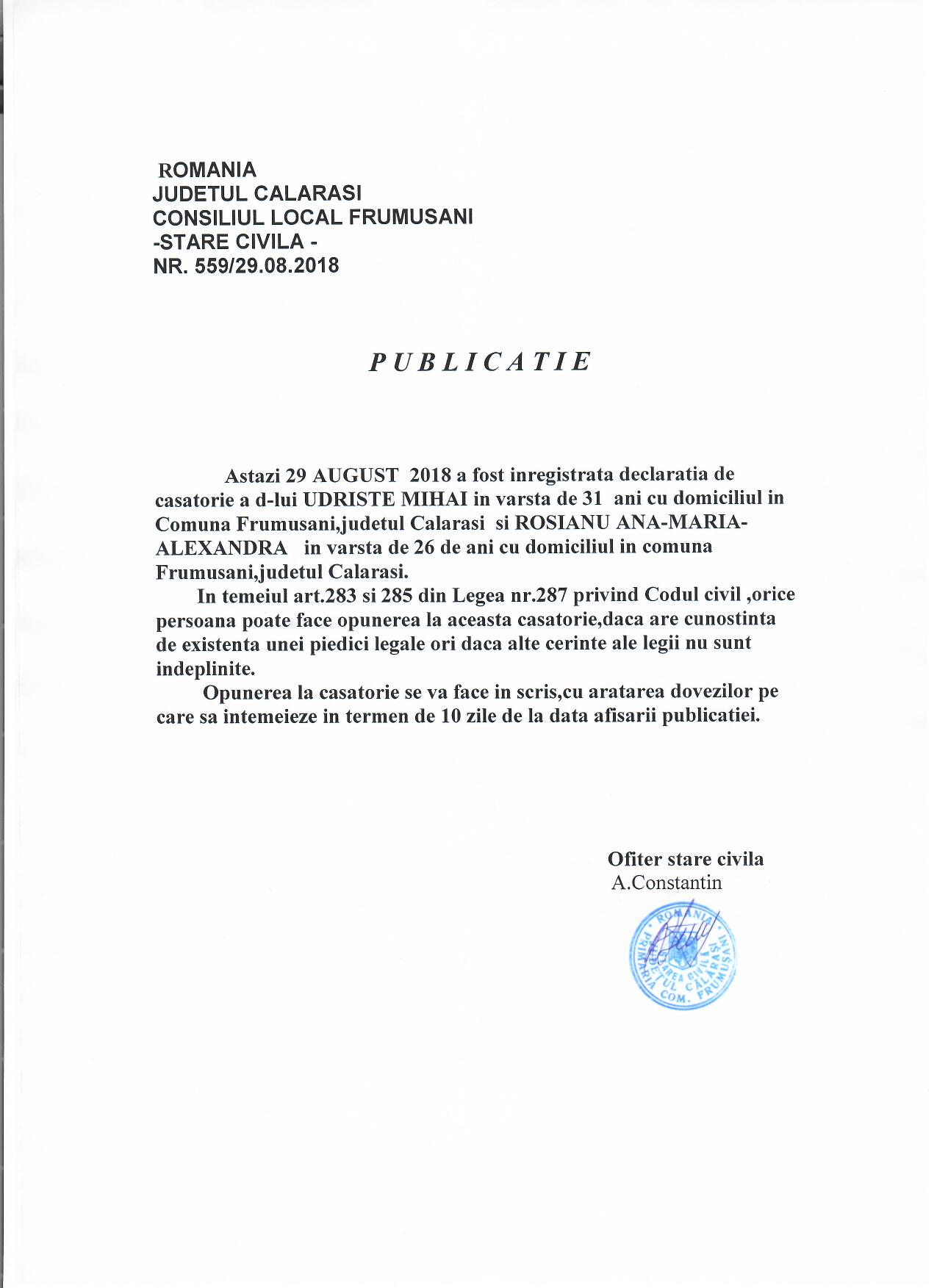 Stare Civila 29 August 2018 Hits: 1114 Declaratie de casatorie - Udriste Mihai si Rosianu Ana-Maria Print Email PDF Declaratie de casatorie - Udriste Mihai si Rosianu Ana-Maria Prev Next